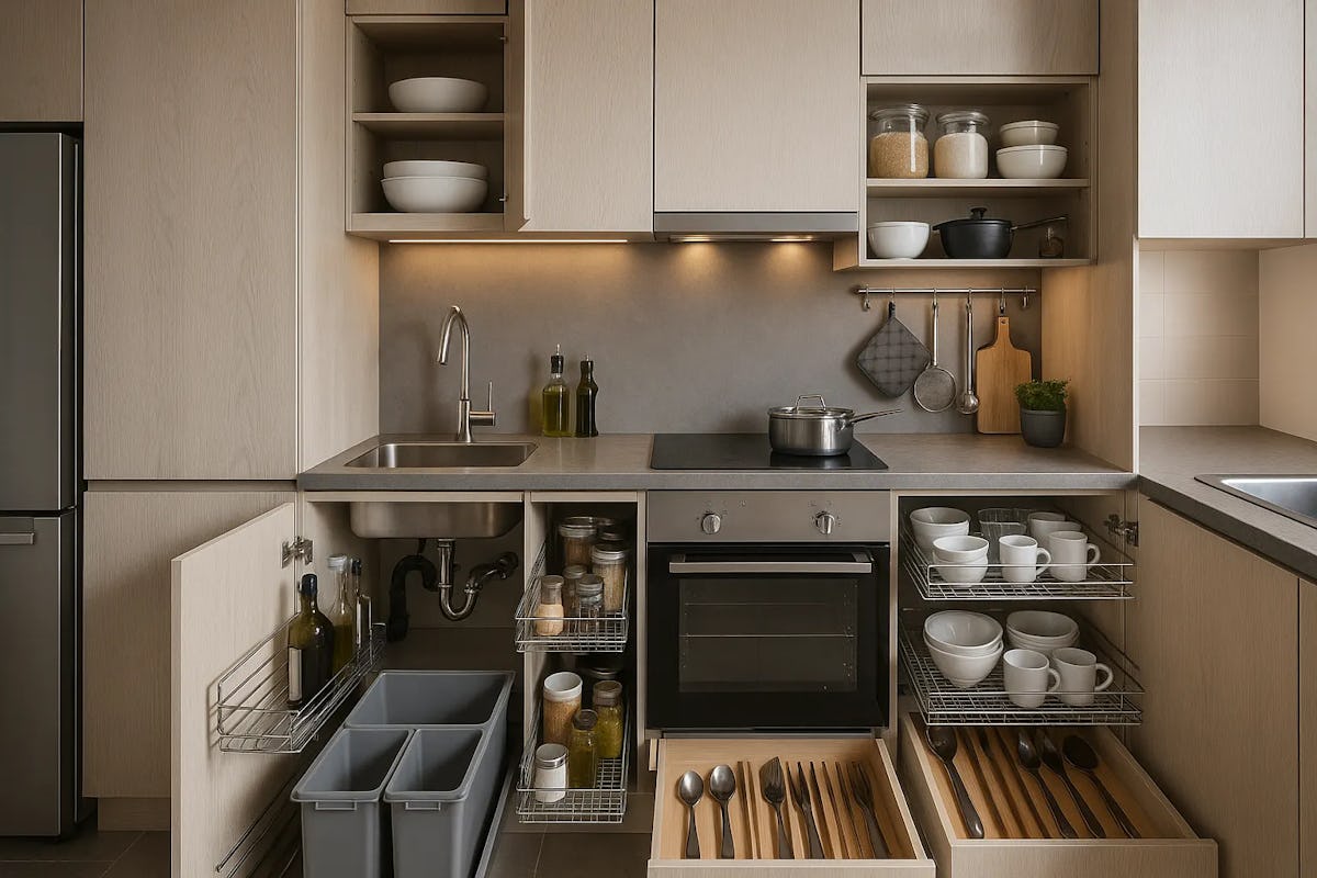 Préférez les tiroirs à l’anglaise : ils doublent la capacité intérieure par rapport à une porte simple et permettent d’organiser facilement sans fouiller.